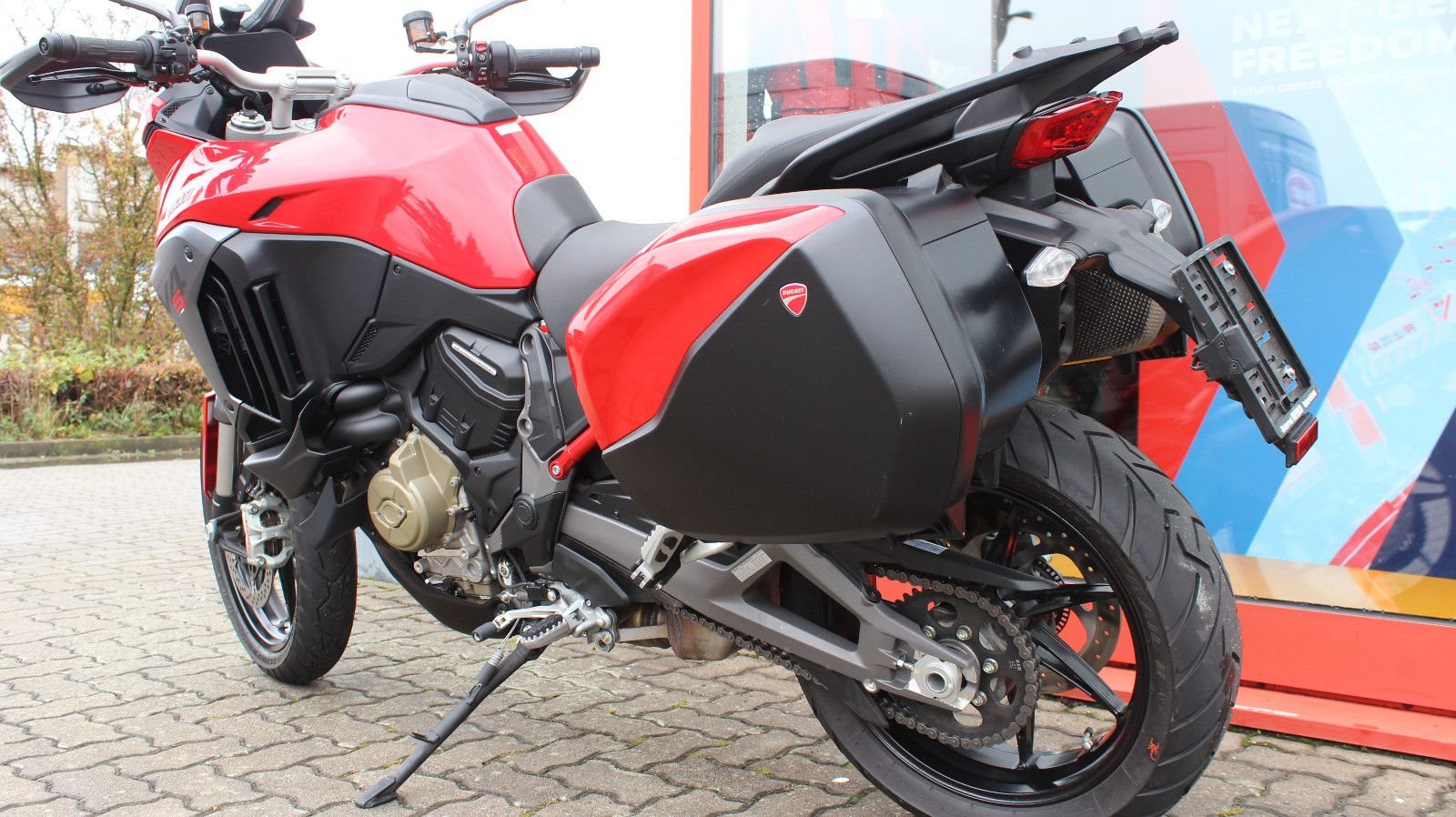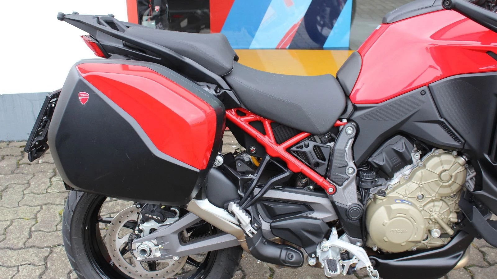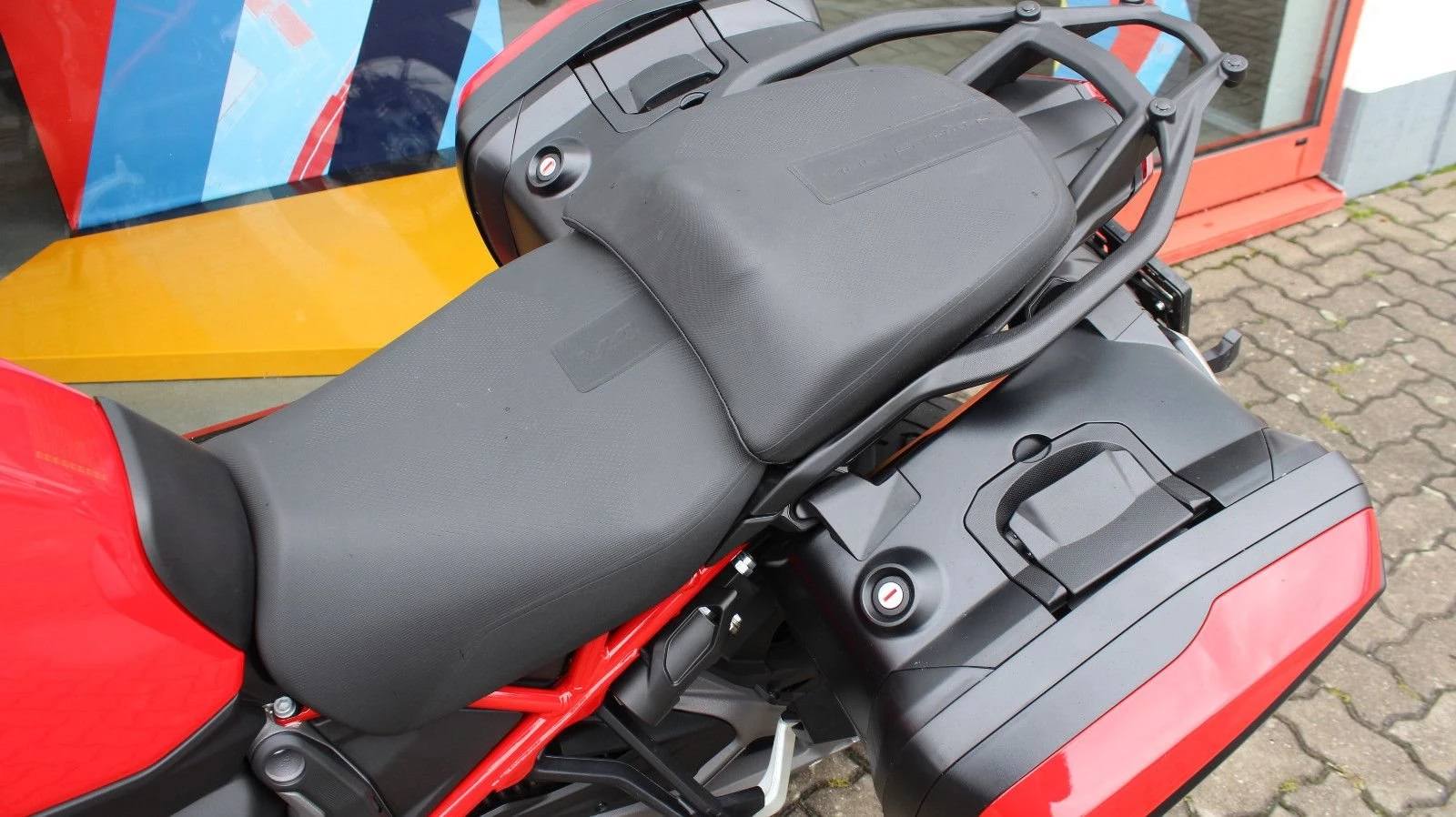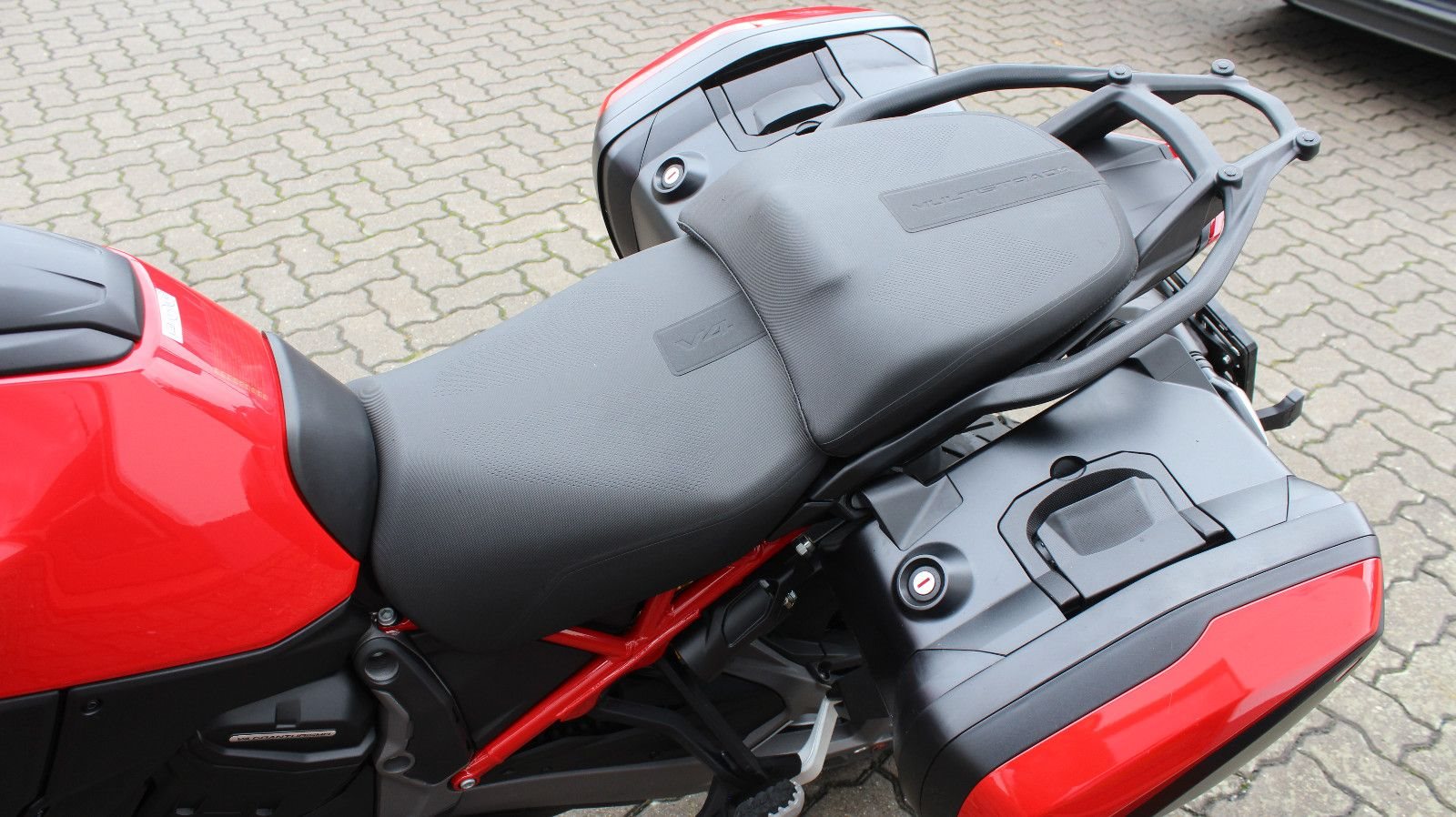 Es wurden nachträglich original Ducati Seitenkoffer in Fahrzeugfarbe montiert.